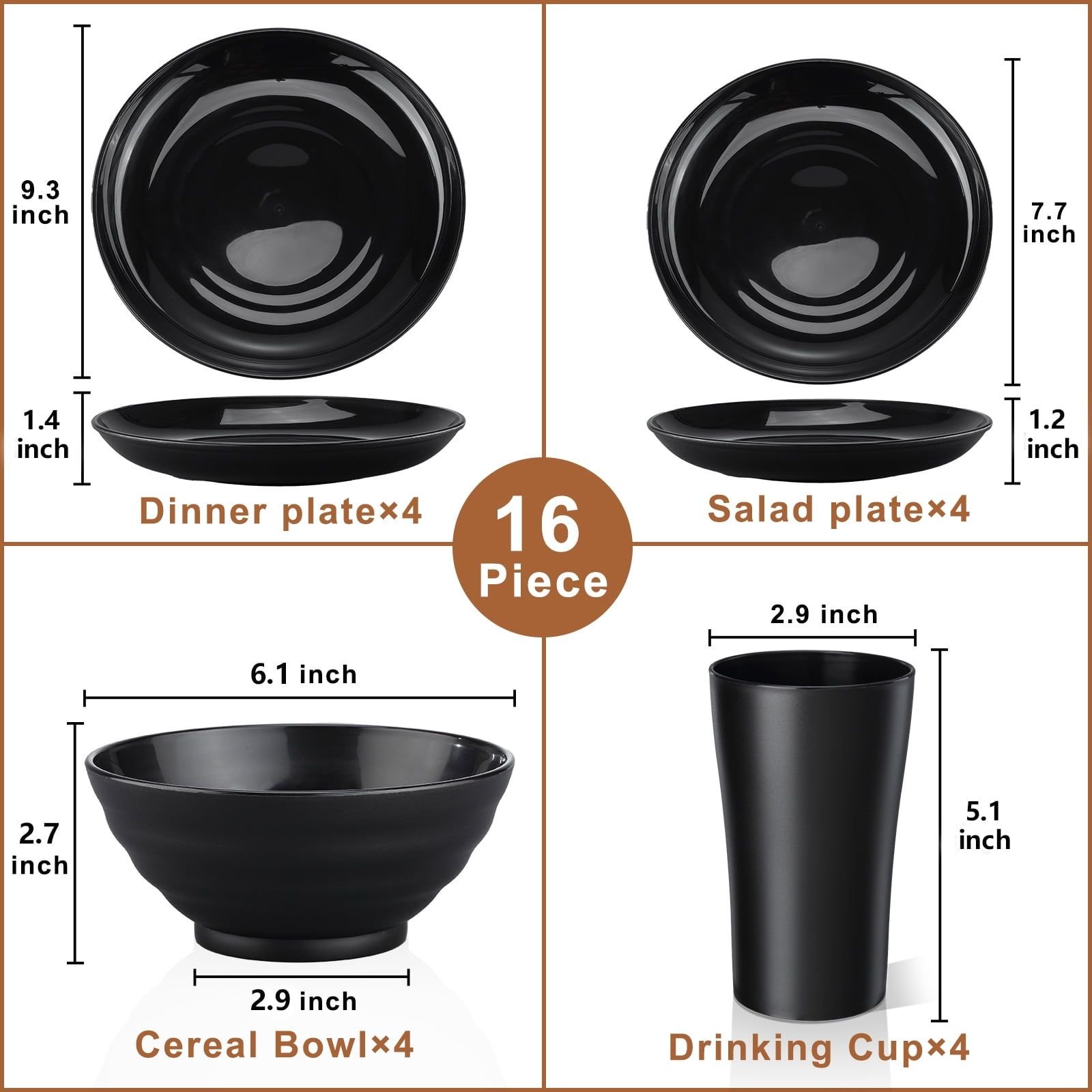 Black Dinnerware Set for 4, 16 Pack Plastic BPA-Free Dinner Plates, Salad Plates, Cereal Bowls, Cups, Unbreakable Plates and Bowls Sets